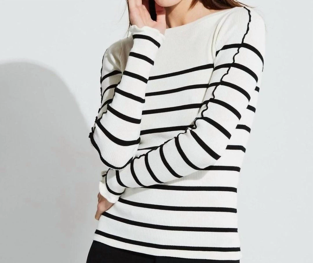 Ivory fitted long sleeve rib shirt with black stripes and sleeve detail