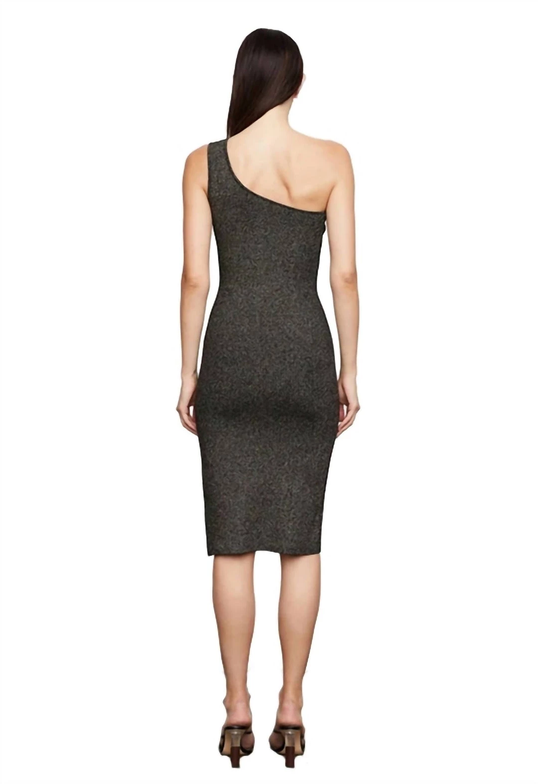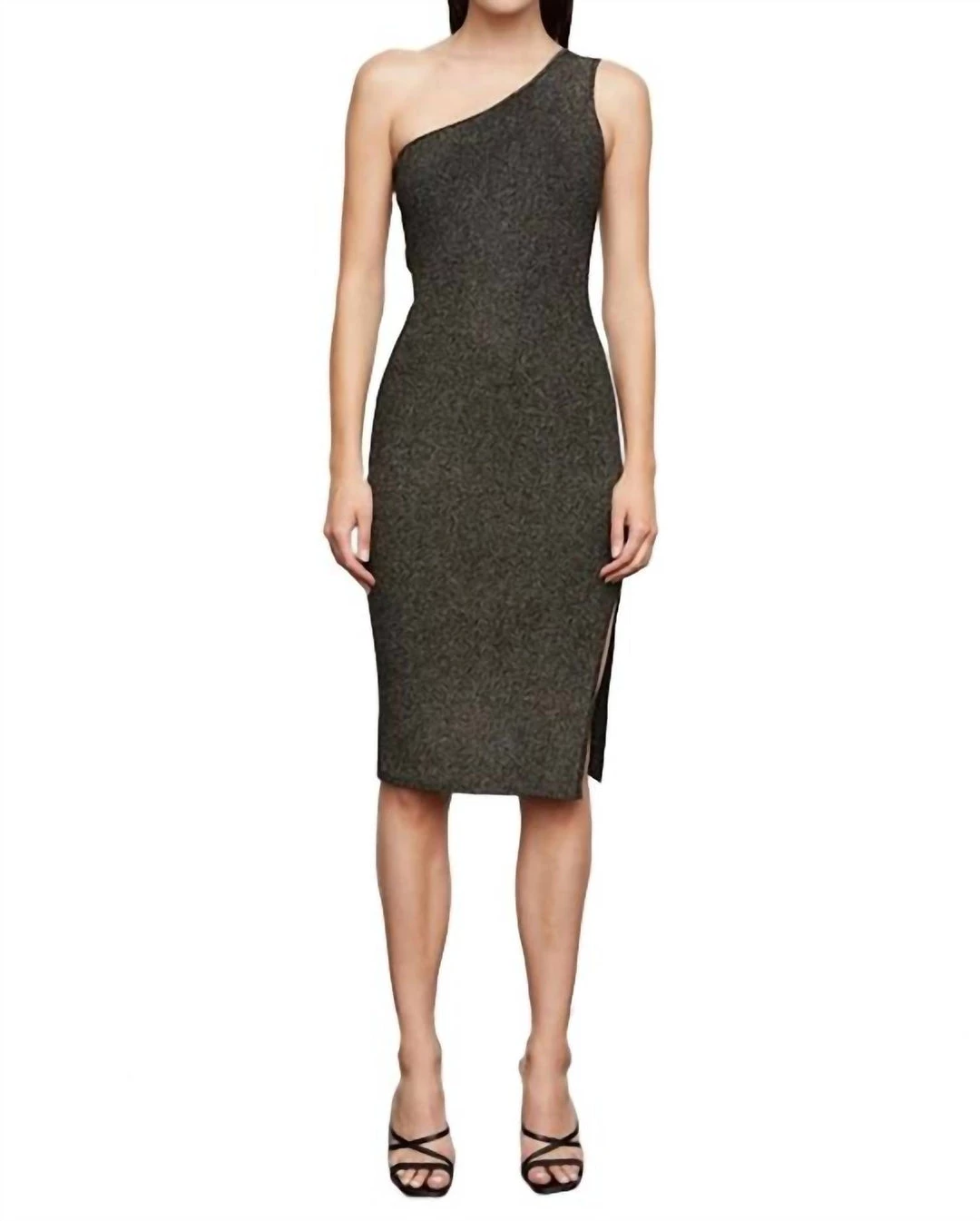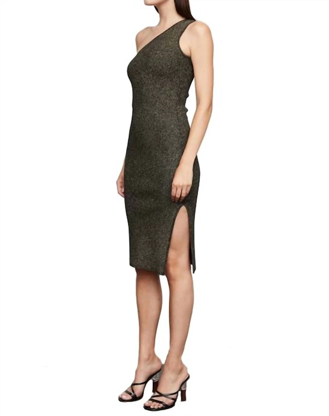 Features an asymmetric neckline, fitted silhouette, side seam slit and allover Lurex thread. This sweater dress is unlined.