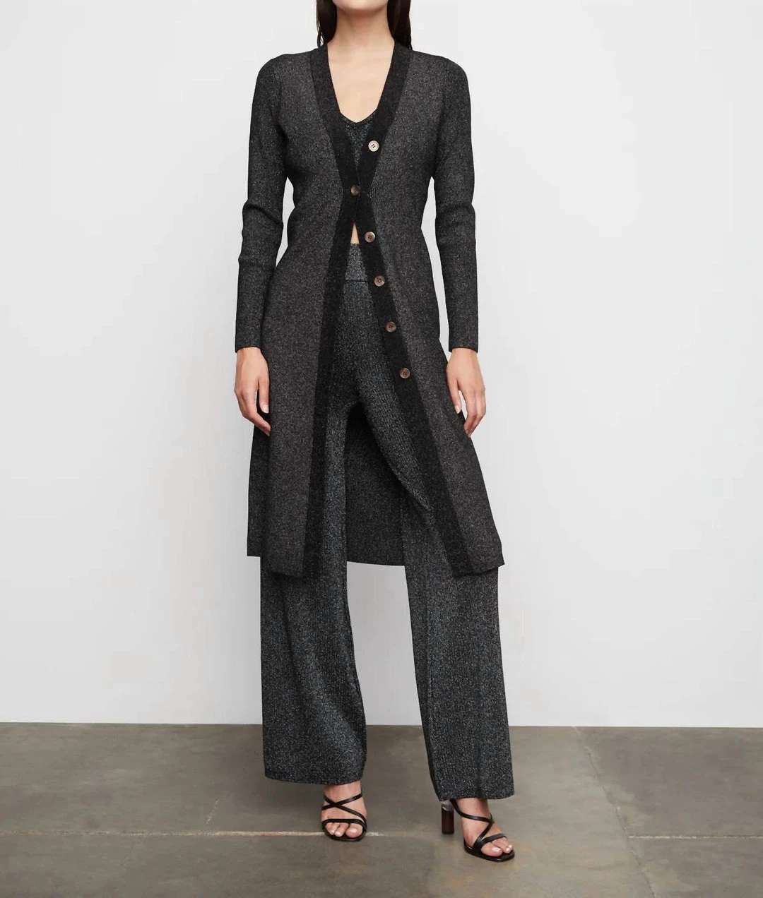 Tortoise colored buttons, contrast black placket, and a modern v shaped neckline.