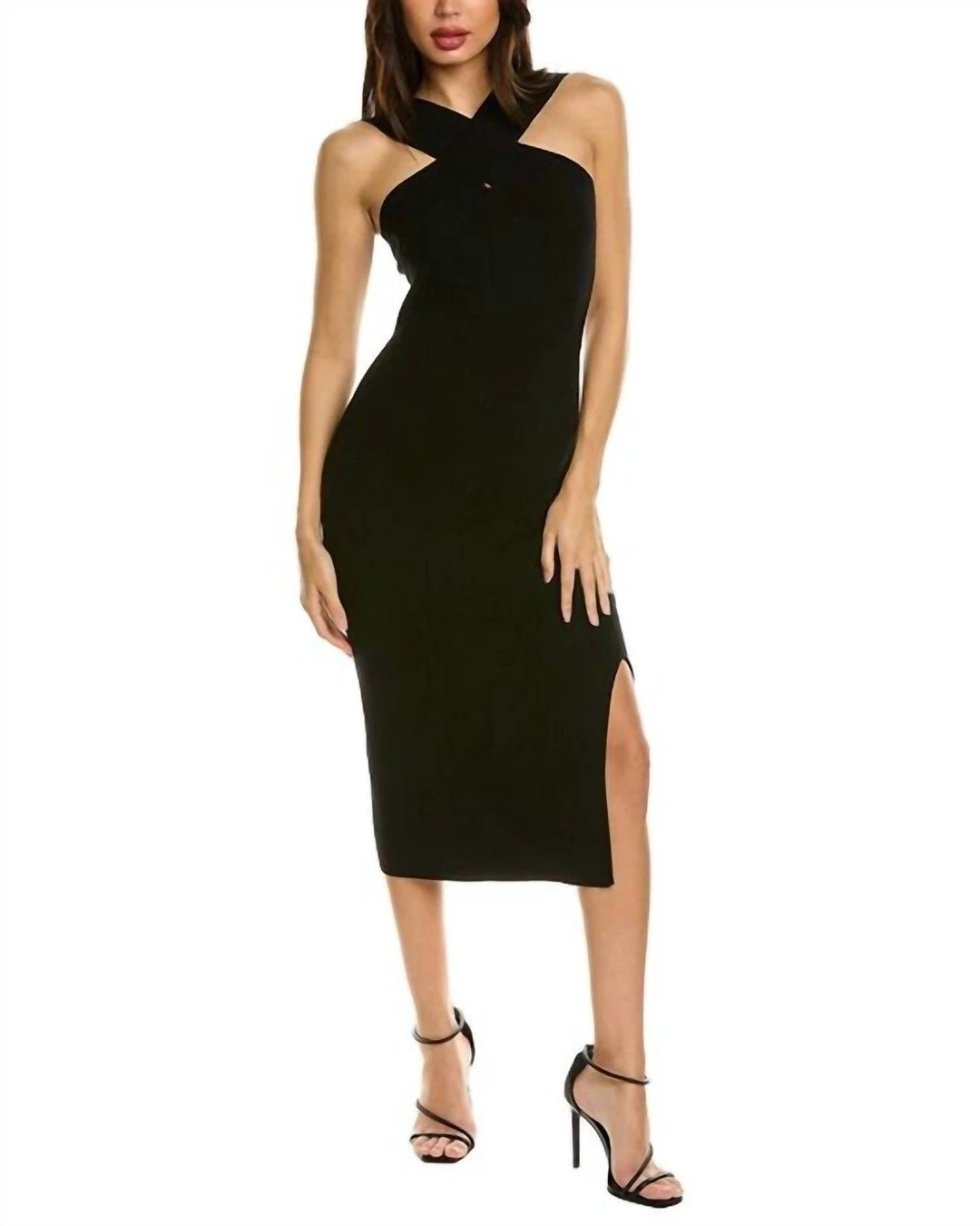 Edith Sweaterdress in black with ribbed design, crossover neckline, and slit at hem. Approximately 46in from shoulder to hem. Model is 5’9 and is wearing a size small. Measurements may vary slightly by size. Slip-on styling. . Dry clean only.