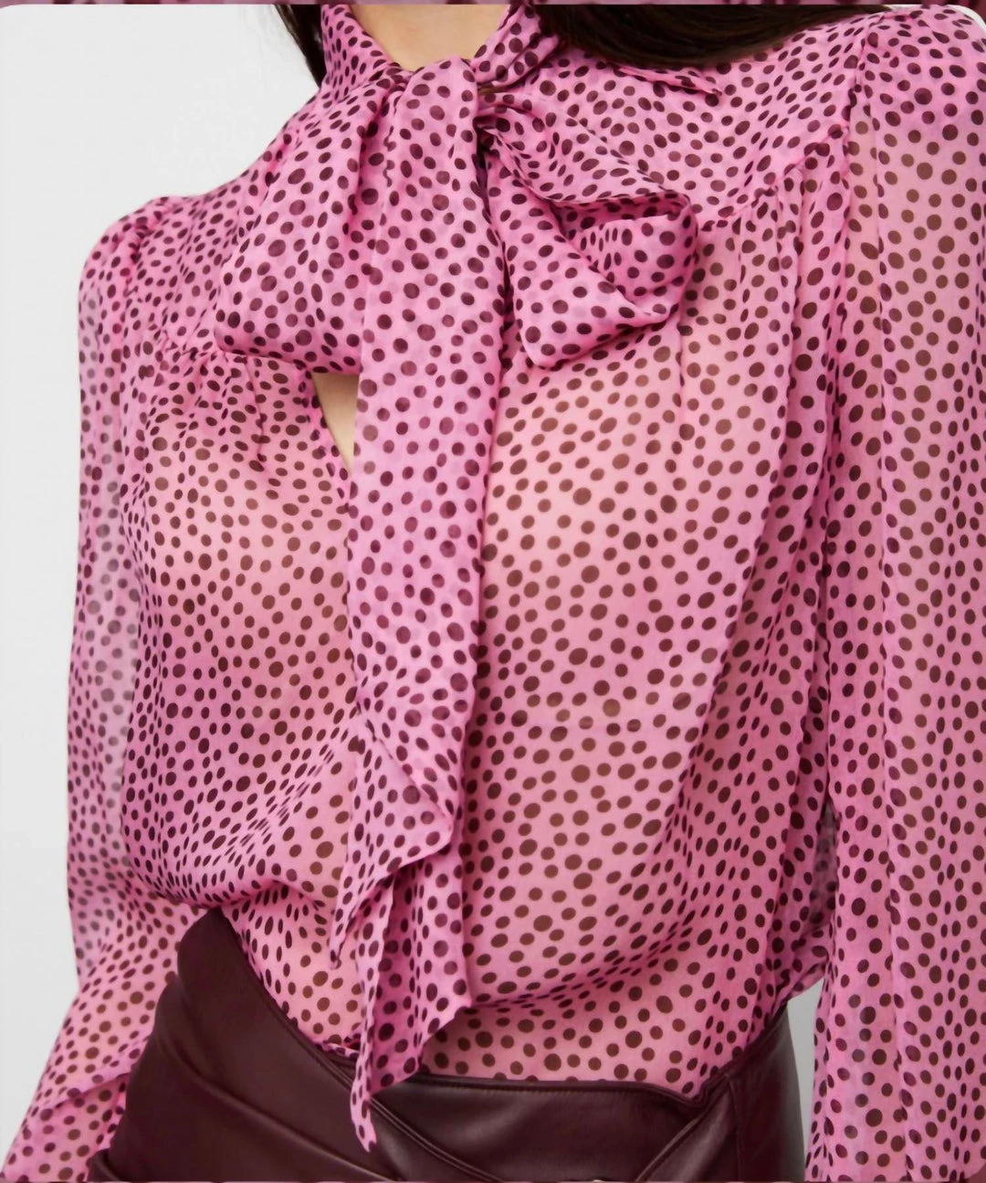 Pink/burgundy long sleeve bow-tie blouse in our confetti printed georgette. Straight edge hemline hits blow the waist and can be worn out or tucked in. 100% Polyester Imported Dry Clean Only
