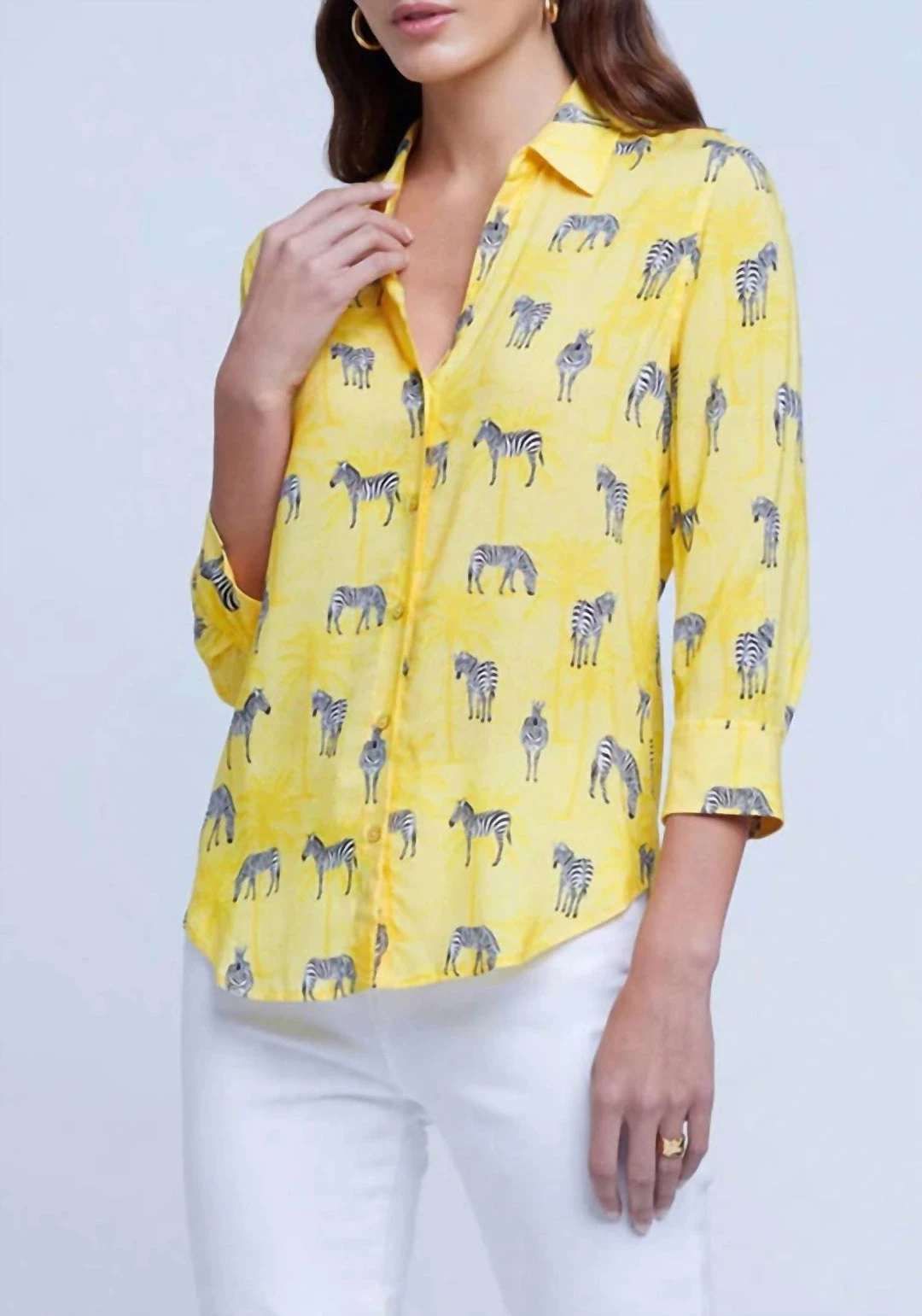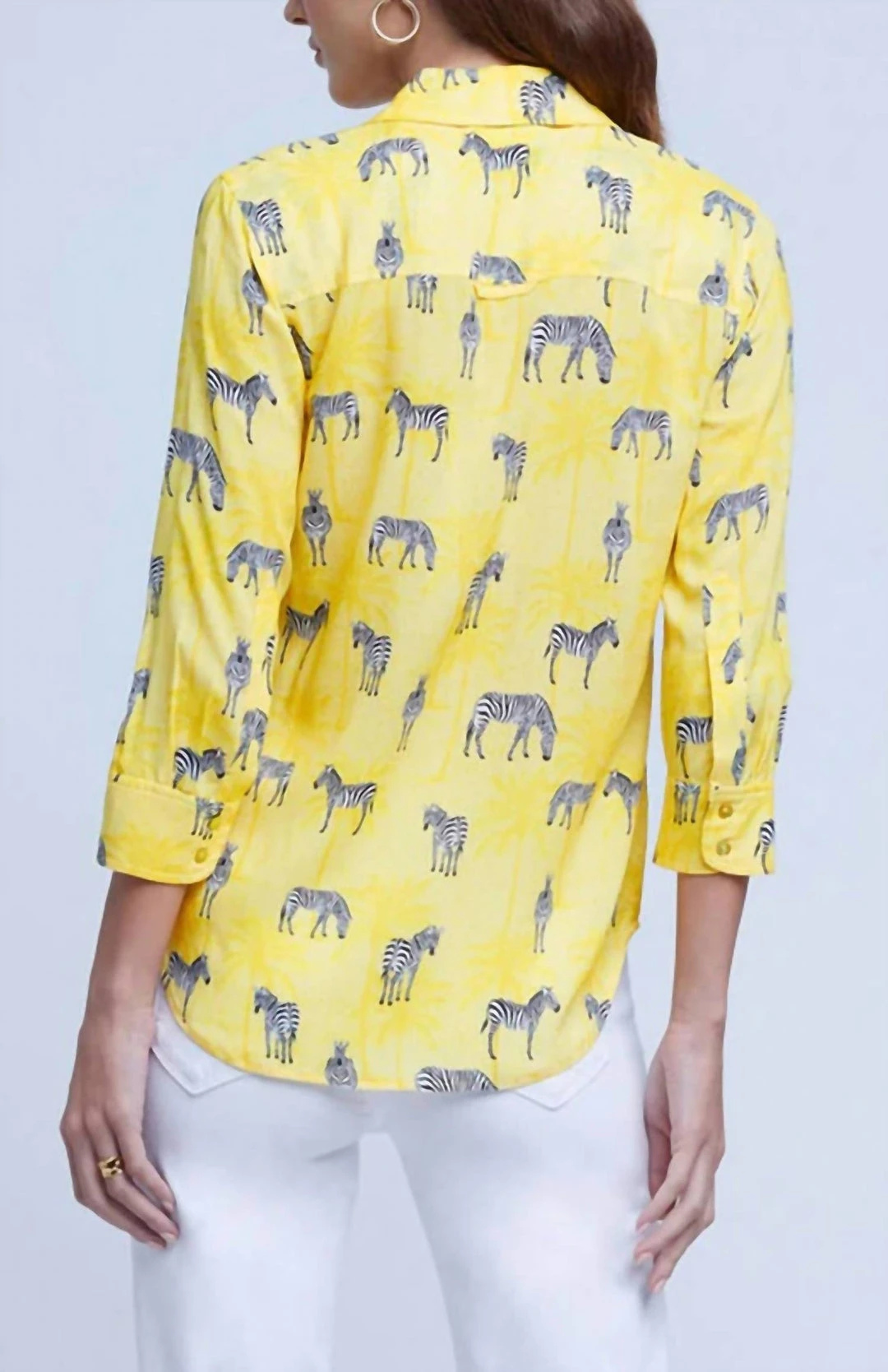 Featuring a bold zebra print set against a maize-yellow palm tree background. Includes a three-quarter sleeve, back yoke with loop, and shaped shirttail hem. Soft, luxe fabric enhances feminine drape. Front tonal button closure.