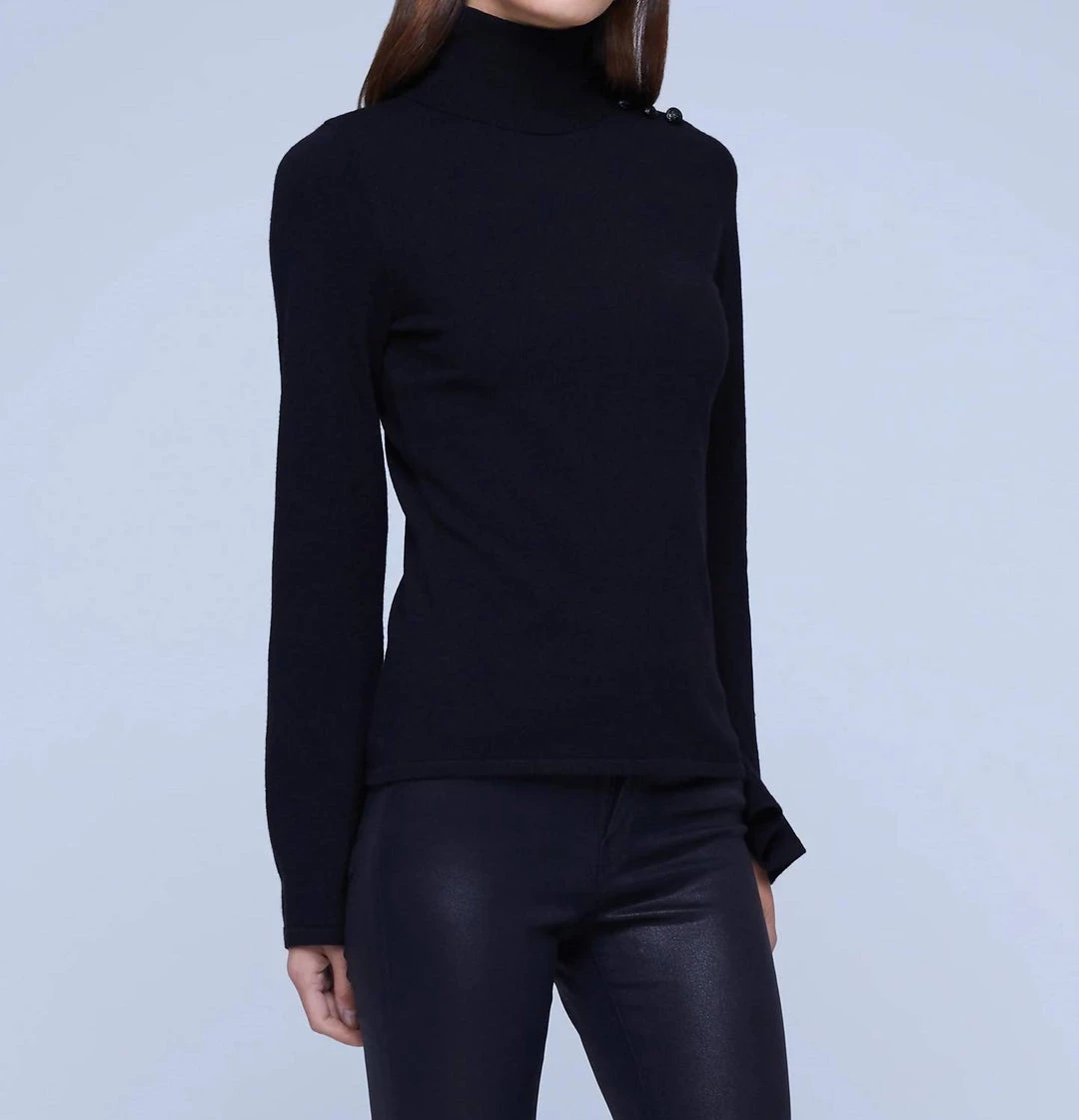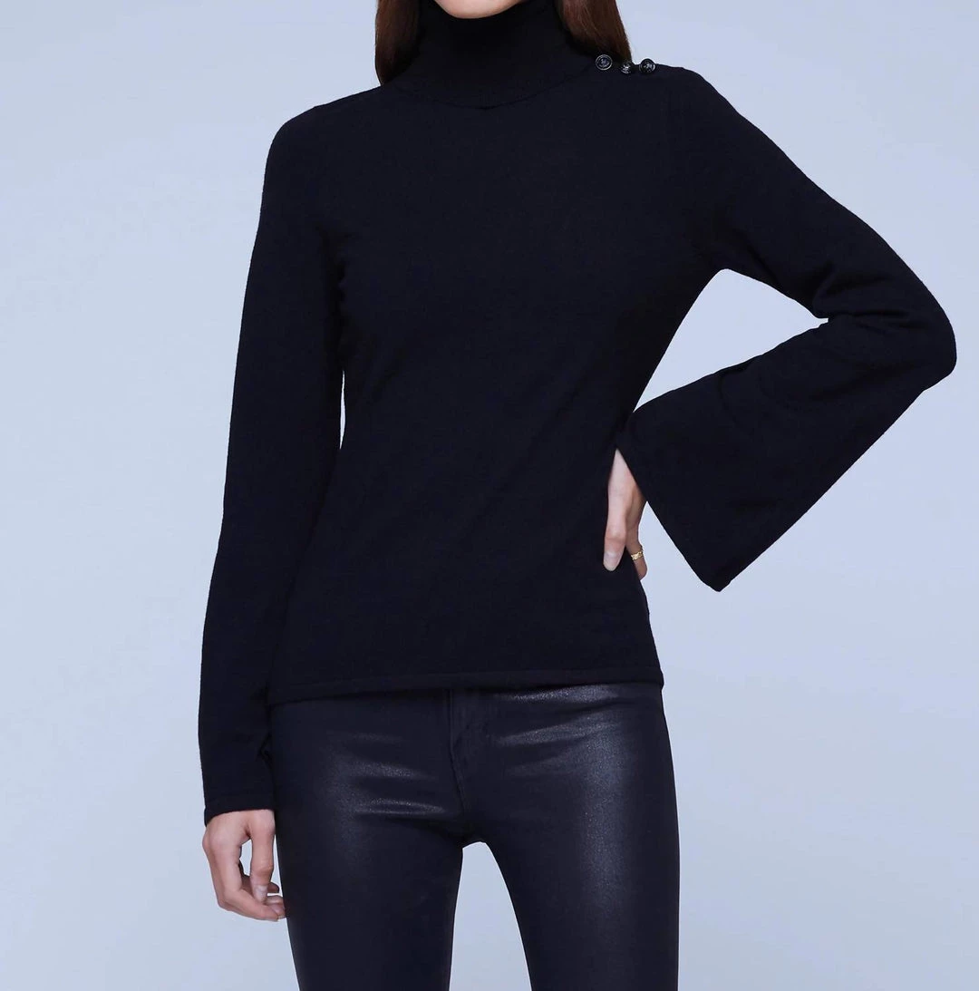 A turtleneck sweater. Classic slim-fit style updated with a feminine bell sleeve. Soft hand of premium knit falls beautifully over the figure and enhances the drape of the sleeve. One shoulder adorned by a trio of tonal buttons. About 23.2″ From Shoulder to Hem. Sleeve Length – 24.25″. Model Details – Height – 5’10” | Bust – 32″ | Waist – 24” | Hips – 34.5” | Wearing Size XS Imported