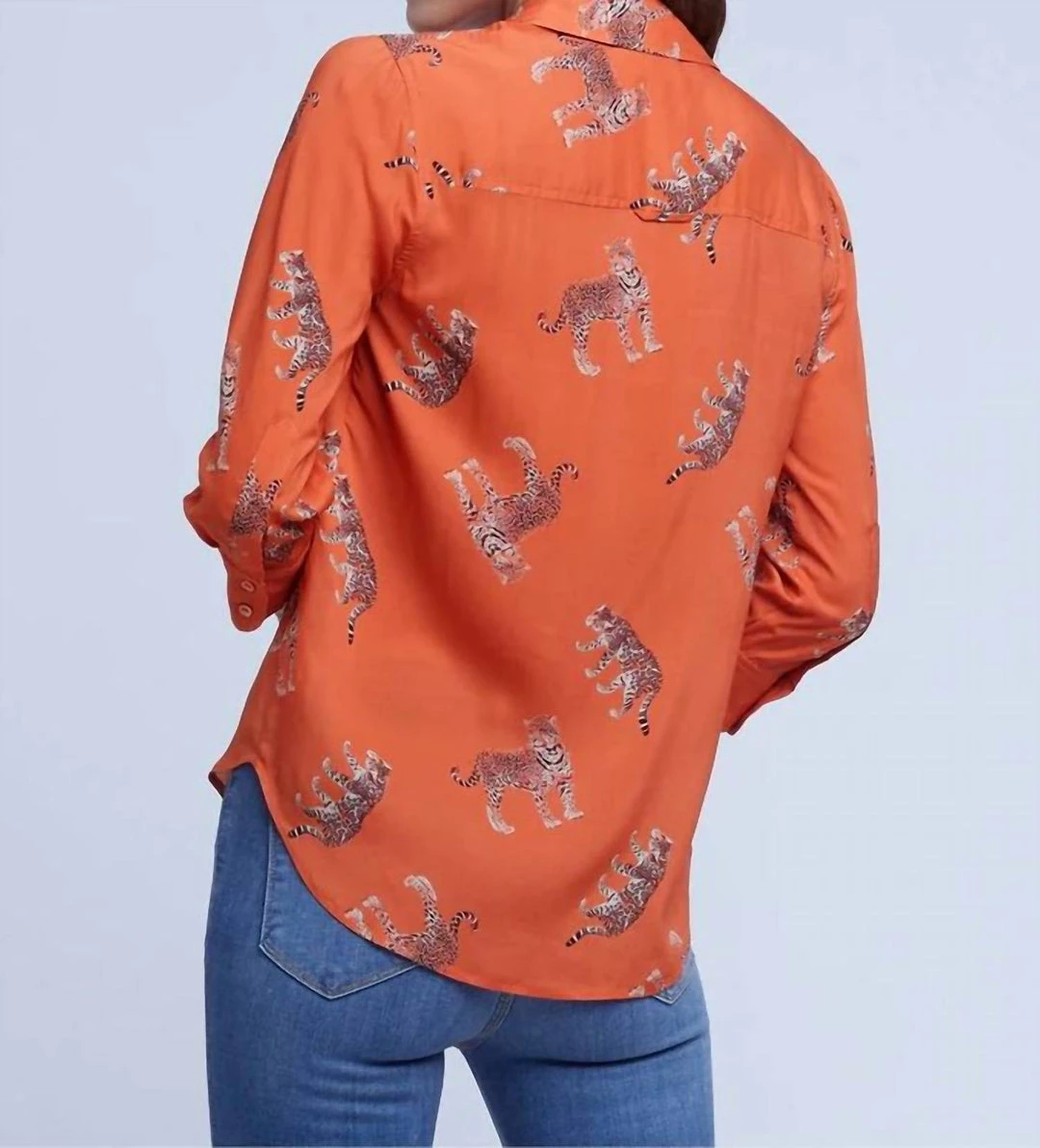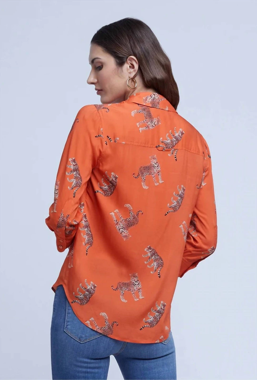 Viscose button up blouse with 3/4 sleeve and panther animal detail.